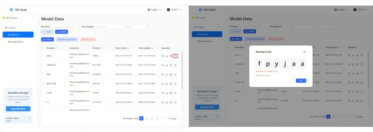 • On the project list, click the share icon, set the validity period, and generate a share code to send to the recipient.
