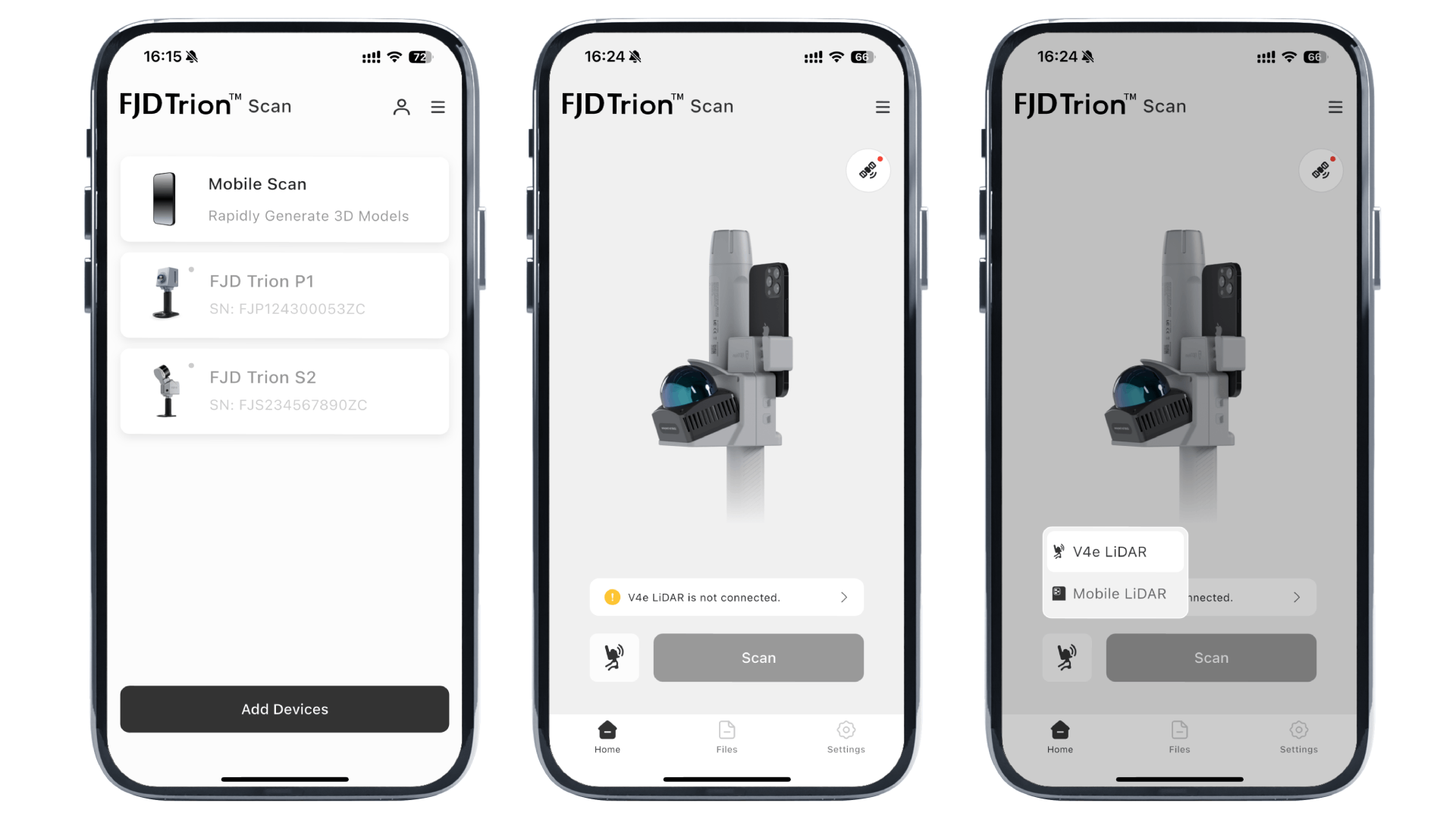 Open the Scan App and tap Mobile Scan at the top. The device should be V4e LiDAR (if not, switch it using the bottom-left button). Tap the prompt at the bottom for the connection steps.