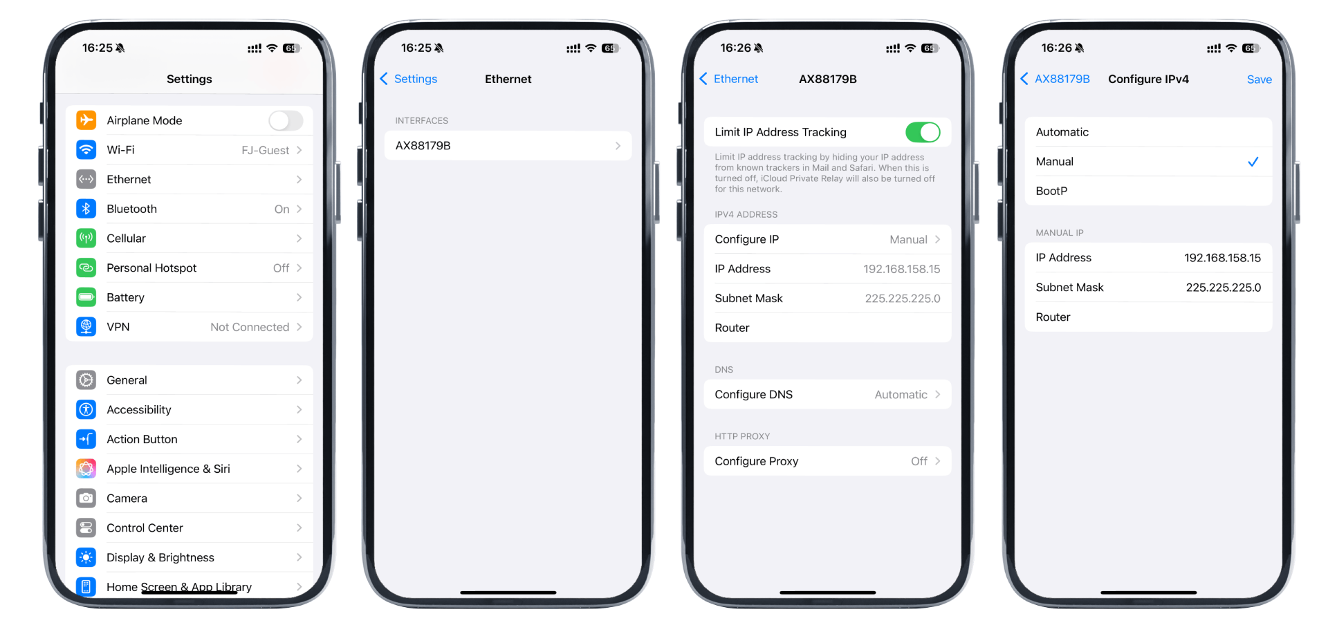 Power on the V4e LiDAR and connect it to the iPhone. Then, go to iPhone Settings->Ethernet to configure the IP address.
