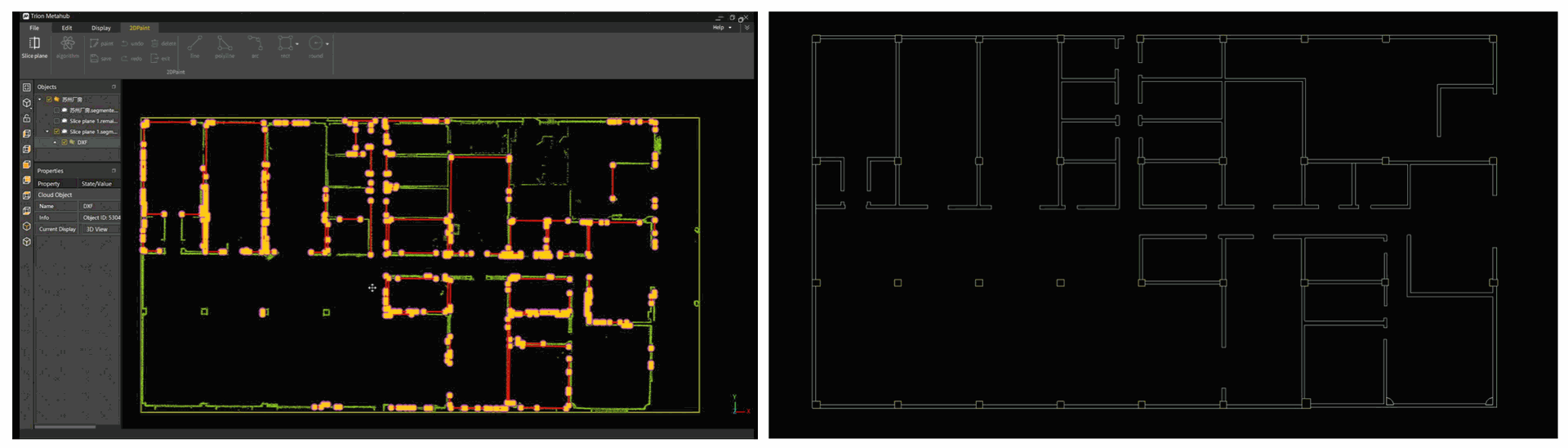 Relevant floor levels were selected in the FJD Trion Model for automatic contour extraction and 2D floor plan generation, followed by editing and optimization to produce DXF floor plan drawings.