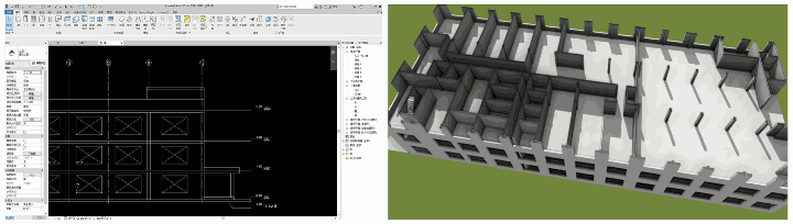 Using BIM software like Autodesk Revit, walls, beams, and columns were built based on the point cloud model. After completing the BIM model, the visualization was inspected in a rendering software.