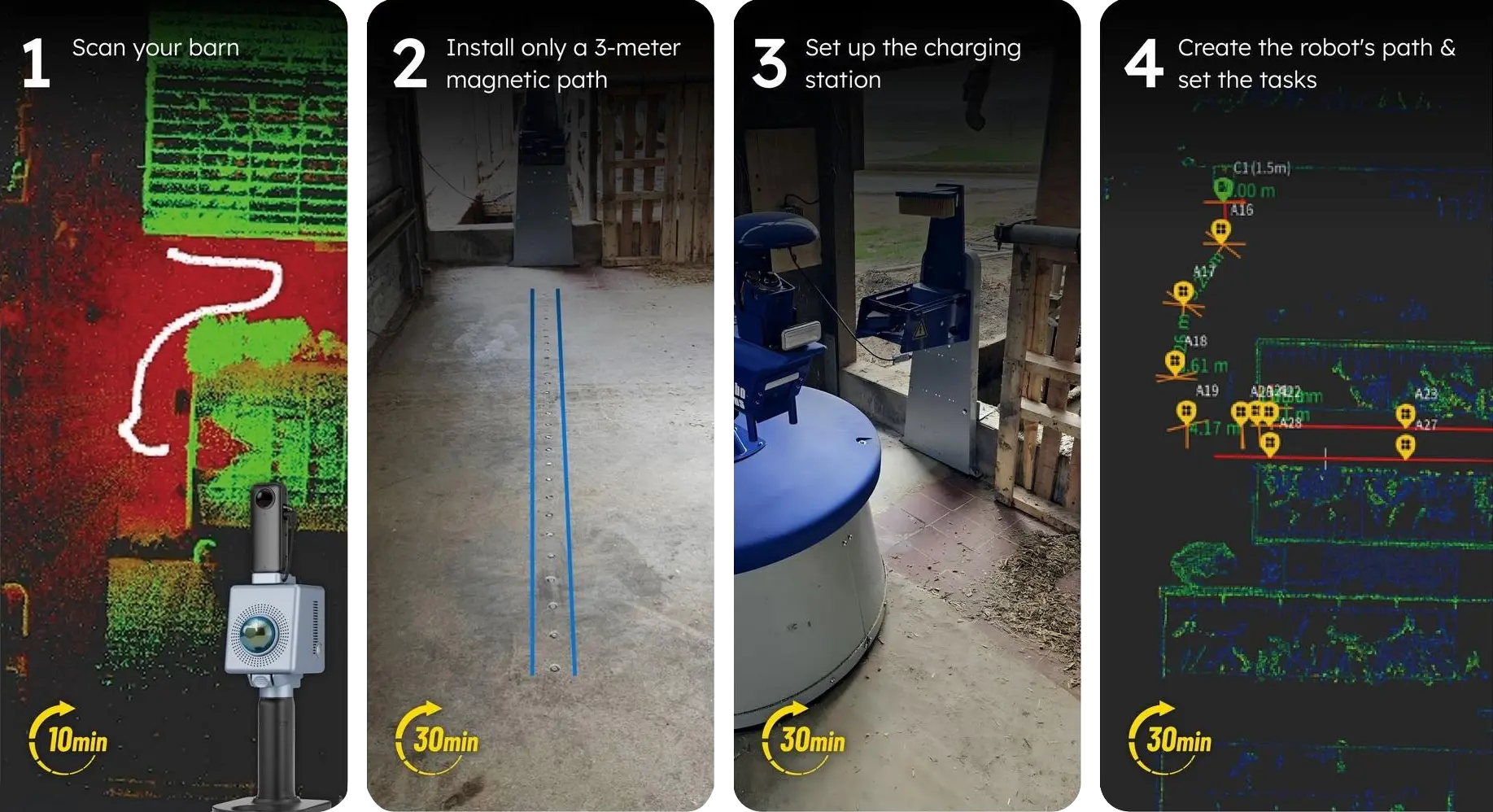 With the FJD Trion P1 LiDAR Scanner, mapping your farm becomes fast, accurate, and fully digital. In less than two hours, you can capture a cent​imeter-level 3D map of your barn, analyze the data, and generate a reliable digital guide to deploy the Nimbo X feed pusher — with future compatibility for other automation solutions.
